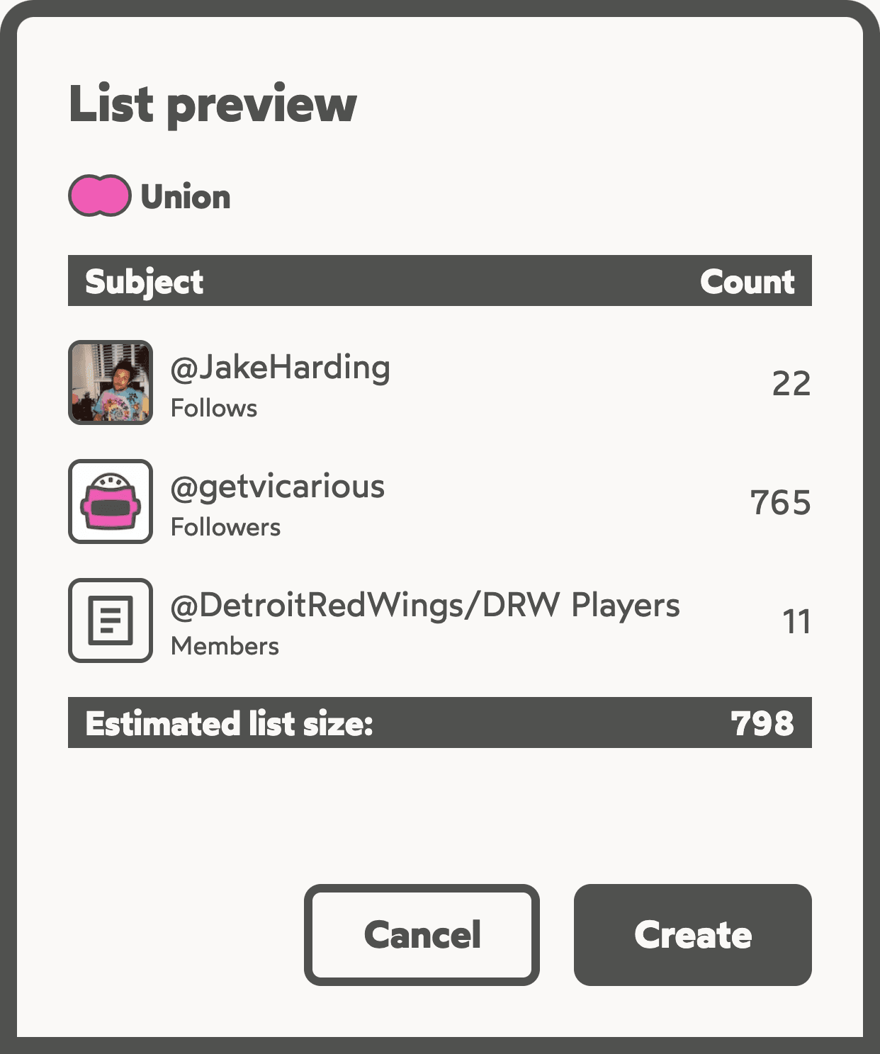 To create a list on Vicariously, you provide a list of subjects. Historically, the only subject type was the follows of a user, so this was pretty simple. You'd enter a Twitter handle and it'd resolve to that user's follows.